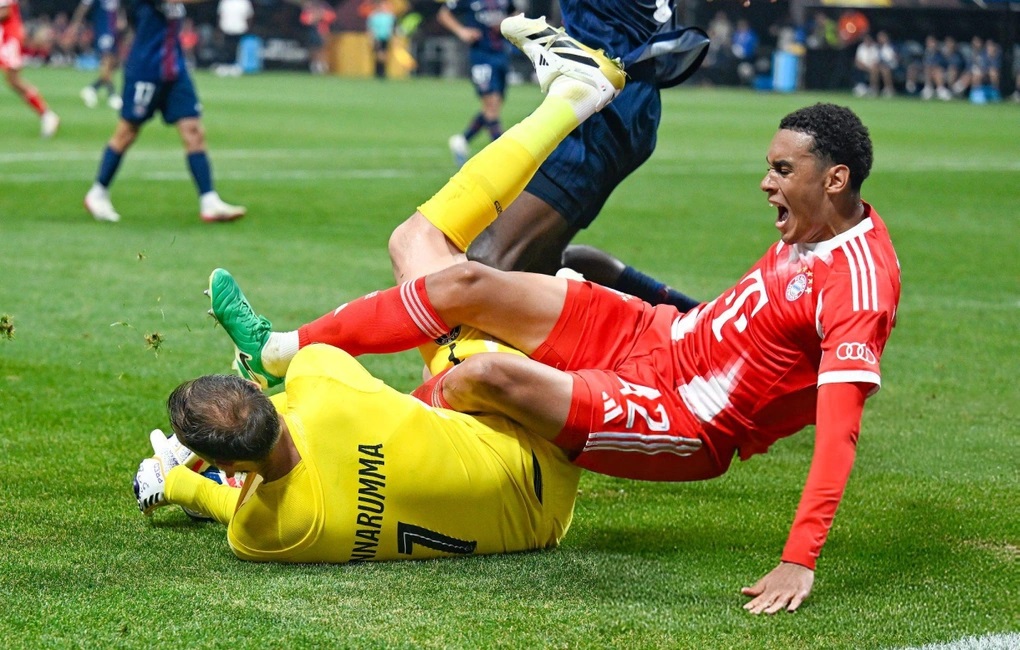 Azonban a Bayern támadója, Jamal Musiala szerette volna elhalászni azt az elé beálló Pacho elől. Viszont ahogyan belépett a védő elé úgy ütközött Donnarummával, hogy az azt követő képsorok nagyon rosszul néztek ki. Ugyanis az olasz hálóőr gyakorlatilag begyűrte a Bayern új tízesének lábát a karjait.