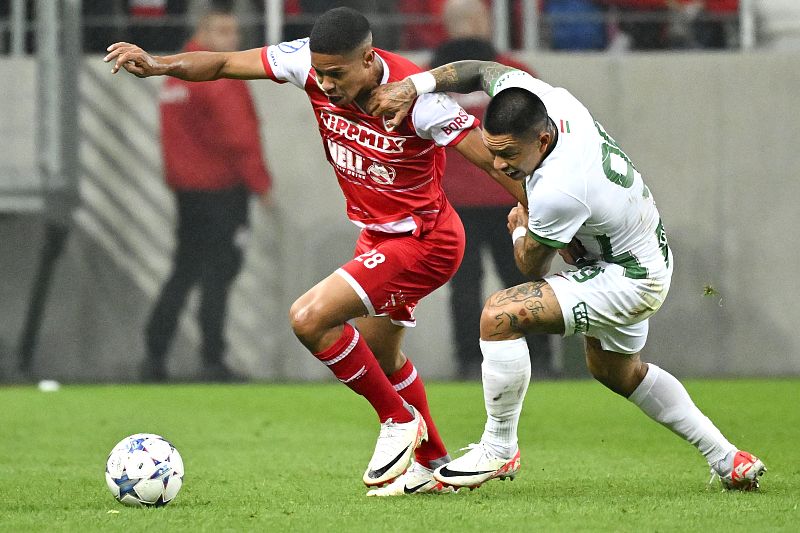 Pernambuco, a Diósgyőr (b) és Cristian Ramirez, a Ferencváros játékosa a labdarúgó OTP Bank Liga 10. fordulójában játszott Diósgyőri VTK – Ferencvárosi TC mérkőzésen a diósgyőri DVTK Stadionban 2023. október 22-én. MTI fotó: Czeglédi Zsolt