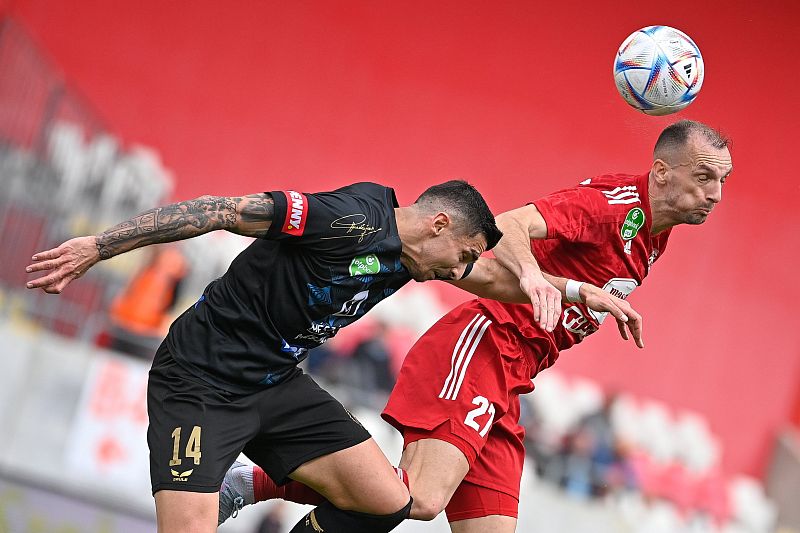 A felcsúti Wojciech Golla (b) és a kisvárdai Jasmin Mesanovic a labdarúgó OTP Bank Liga 25. fordulójában játszott Kisvárda Master Good – Puskás Akadémia FC mérkőzésen a kisvárdai Várkerti Stadionban 2023. április 1-jén. MTI fotó: Czeglédi Zsolt