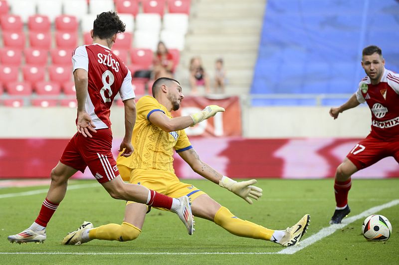 Szűcs Tamás (b) és Bárány Donát (j), a DVSC játékosai valamint Gundel-Takács Bence, a ZTE kapusa a labdarúgó OTP Bank Liga 6. fordulójában játszott Debreceni VSC – ZTE FC mérkőzésen a debreceni Nagyerdei Stadionban 2024. augusztus 31-én. MTI fotó: Czeglédi Zsolt