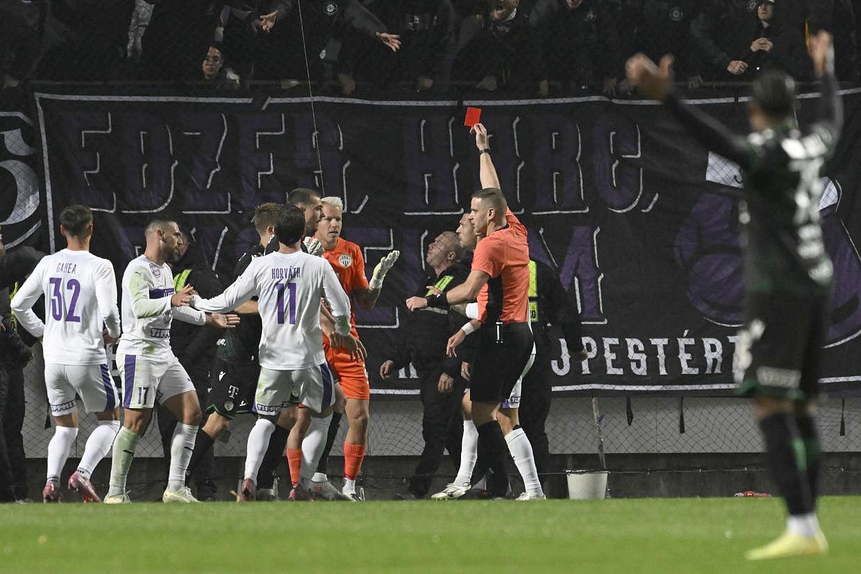 Bogár Gergő játékvezető (j2) kiállítja Gróf Dávidot, a Ferencváros kapusát (b6) a Fizz Liga 10. fordulójában az Újpest FC – Ferencvárosi TC mérkőzésen a Szusza Ferenc Stadionban 2025. október 19-én. MTI fotó: Szigetváry Zsolt