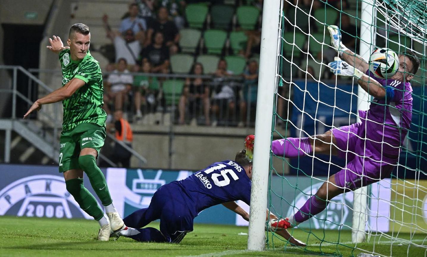 Windecker József, a Paks játékosa (b) gólt lő a labdarúgó Konferencia Liga második selejtezőkörében játszott Paksi FC – NK Maribor mérkőzésen Pakson 2025. július 24-én. Középen Jan Repas, jobbról Azbe Jug kapus, a Maribor játékosai. MTI fotó: Vasvári Tamás