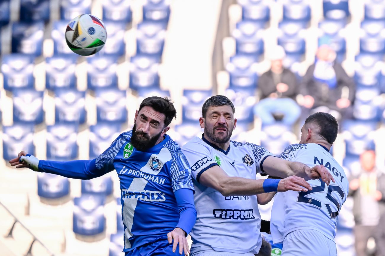 Patrizio Stronati (k) és Nagy Zsolt (j), a Puskás Akadémia FC, valamint Ilia Beriashvili (b), az MTK Budapest játékosa a labdarúgó OTP Bank Liga 26. fordulójában játszott Puskás Akadémia FC MTK Budapest mérkõzésen a felcsúti Pancho Arénában 2025. április 6-án. MTI fotó: Vasvári Tamás