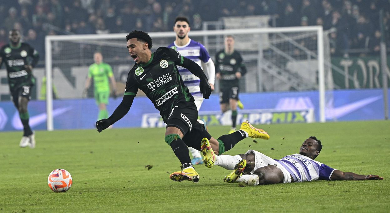 (Borítókép: A ferencvárosi Ryan Mmaee (b) és az újpesti Vincent Onovo a labdarúgó OTP Bank Liga 18. fordulójában játszott Ferencvárosi TC-Újpest FC mérkőzésen a Groupama Arénában 2023. február 5-én. MTI fotó: Szigetváry Zsolt)