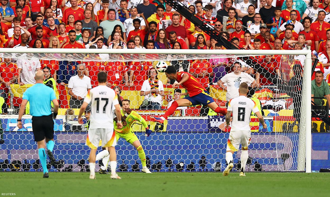 A spanyol labdarúgó-válogatott hosszabbítás után, a 119. percben fejelt góllal 2-1-re legyőzte a házigazda német csapatot az Európa-bajnokság első, pénteki negyeddöntőjében.