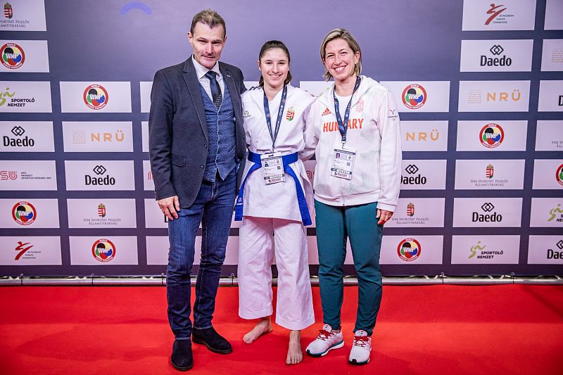 Kákosy Olívia edzőjével Gasparik Kittivel és dr Tahon Róbert MKSZ főtitkárral. Fotó: Jani Martin