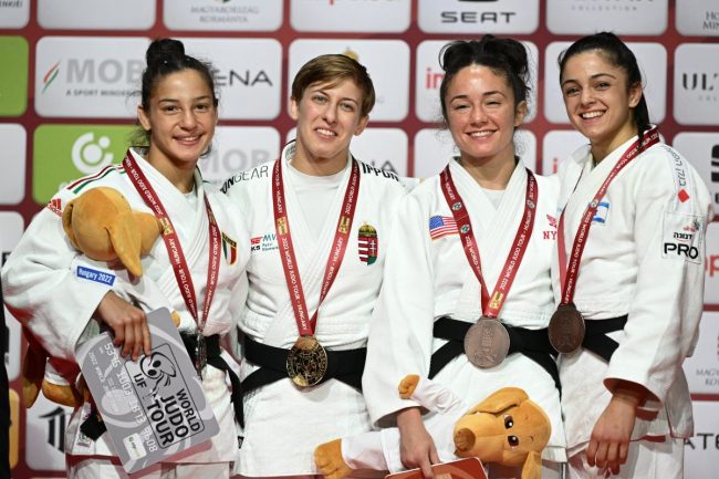 Az aranyérmes Pupp Réka (b2), az ezüstérmes az olasz Giulia Carna (b) és a harmadik helyezett amerikai Angelica Delgado (j2) és az izraeli Gefen Primo (j) a nõi 52 kilogrammos súlycsoport eredményhirdetésén. MTI fotó: Illyés Tibor
